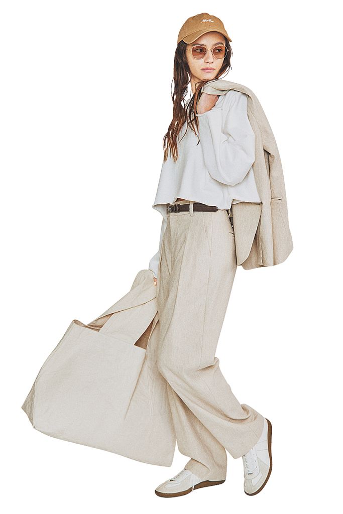 ゆるすぎずルーズにも見えない、肉感を拾わない、脚が短く見えない、合わせにくくない、合わせる靴を選ばない…パンツに求めたい様々な条件をスウェット素材で満たす、「スウェットらしくない」パンツ。白×ベージュのやさしげな配色により、ラフなスエットパンツもクリーンに着地。 スエットパンツ/エイトンステイプルズ シャツ/STERNBERG(アダストリア)
