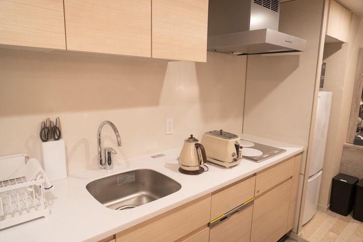 夕食は外食も良いけれど、せっかくキッチン付きのお部屋に泊まっているなら、自分で作ってみるのも楽しいもの。オークウッドスイーツ横浜のキッチンは、IHコンロ、電子レンジ、トースター、炊飯器、電気ケトルなどの家電はもちろん、鍋やフライパン、包丁、まな板、ボウル、ザル、食器類まで一通り揃っていて、まさに“暮らすように泊まる”を体現できる空間です。