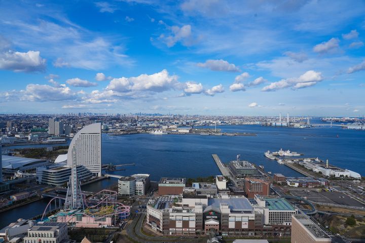 バルコニーからは、みなとみらいの街並みが広がります。目の前にそびえるランドマークタワーや、観覧車「コスモクロック21」、そして赤レンガ倉庫など、横浜の象徴的な建物が視界に収まります。