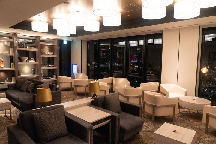 レセプションと同じ46階にあるラウンジは、宿泊者専用の空間。カードキーをかざして入室すると、そこには落ち着いた照明とシンプルながら洗練されたインテリアが広がります。窓際の席に腰を下ろすと、みなとみらいの夜景が目の前に広がり、まるで宝石を散りばめたような光の海に心が奪われます。