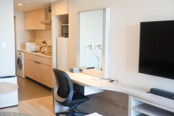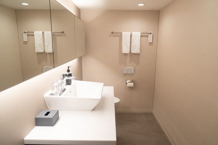 さらに、そのカウンターの正面には大きな鏡があり、ゆったりとメイクや身支度を整えるのにも便利。旅行での滞在はもちろん、仕事での利用にも配慮された設計で、"集中もできて、身だしなみもバッチリ整えられる空間"だと感じました。
