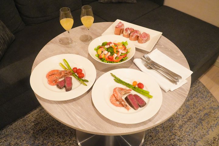 今回は、リンコスで新鮮な野菜と牛肉、海鮮を購入し、シンプルな牛肉とサラダを作ってみました。キッチンの使い勝手が良く、調理もスムーズ。出来上がった料理を、L字型のソファと大きなテーブルがあるリビングスペースで、みなとみらいの夜景を眺めながらいただく時間は、まさに至福のひとときでした。