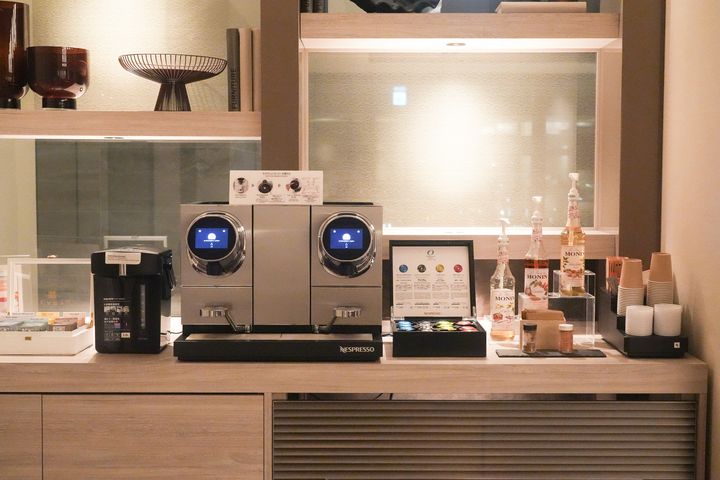 ラウンジ内には、ネスプレッソマシンや各種ティーバッグが用意されています。テレビでは無音でBBC放送が流れており、静かな空間で読書や仕事、ただ夜景を眺めるだけの時間を過ごすのにも最適です。24時間利用可能なこのラウンジは、日中の賑わいから離れて、自分だけの時間を大切にしたい方にぴったりの場所です。
