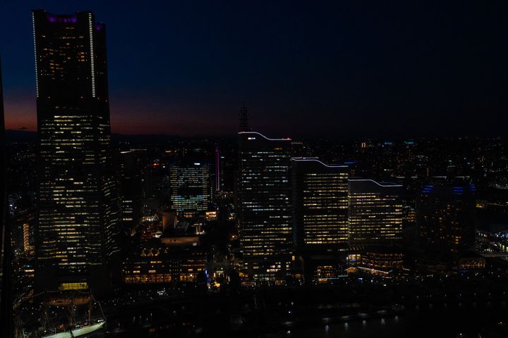 日が沈み、空が深い藍色に染まる頃、窓の外にはみなとみらいの夜景が広がります。