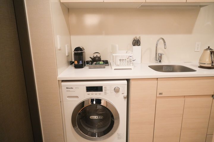 バスルームの目の前には、ドラム式の洗濯乾燥機が完備されていて、これが本当に便利!長期滞在はもちろん、たとえ1〜2泊でも、突然の雨や汗をかいた日にはありがたい存在です。