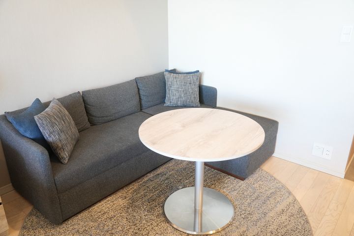 室内は、シンプルながら落ち着きのあるインテリアでまとめられていて、グレーとホワイトのやわらかな色調が印象的。特徴的なのが、部屋の隅ににゆったりと置かれたL字型のソファと、ダイニングも兼ねられる大きなテーブル。このスペースがとにかく居心地抜群で、まるで自分のリビングルームのようにくつろげるんです。