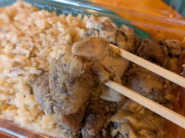 炭火焼きに目がない私は、「鶏めしと炭火焼きしお弁当」(570円)を注文しました。受け取ったパックは予想以上にずっしりと重く、お肉の量の多さに思わずニンマリ。蓋を開けると、幸せ過ぎる香りが鼻腔を刺激します。