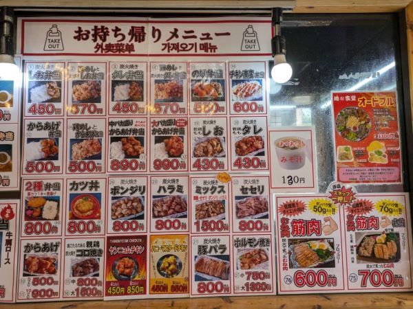 店内にはテイクアウトコーナーもあり、14時近くだったにも関わらずお客さんがひっきりなしに訪れていました。それもそのはず、お弁当がとってもリーズナブルなんです。目移りしそうなくらい豊富なメニューは、500円前後の価格帯のものが多いです。ご飯なしでお肉だけのメニューもありますので、夕食の1品としても重宝しそうですよ。