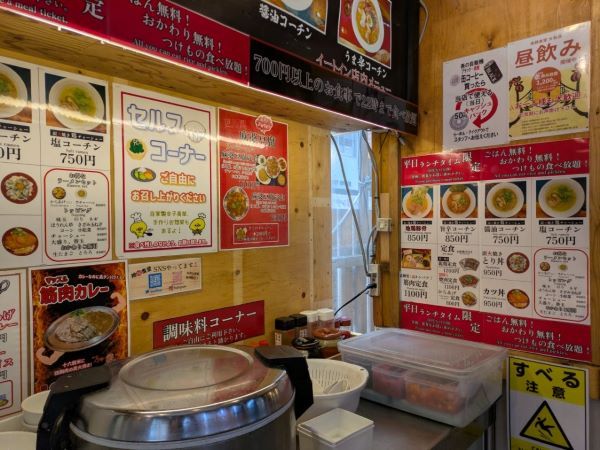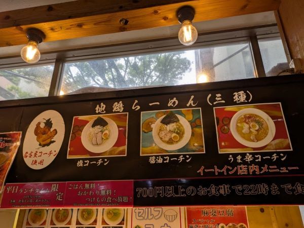 イートインメニューのお勧めメニューは、スープに名古屋コーチンを使用した地鶏ラーメン。3種類あり、平日のランチタイム(11:00~14:00)は、ご飯とお漬物の食べ放題が付きます。