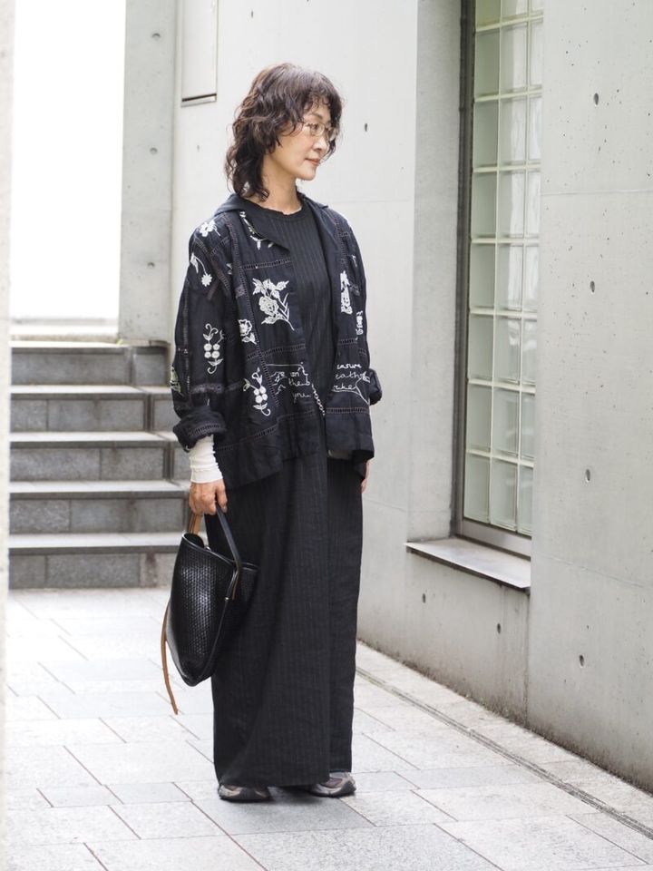 軽やかなリネンの刺しゅうジャケットにコットン素材のオールインワン、バッグはレザーでキリッと引き締め。重くなりがちな黒を基調にしたスタイリングは、異なる素材感のアイテムを組み合わせることで奥行きを出して。色数を抑えた分、質感やディテールにこだわりが垣間見える、モードな雰囲気がステキ。