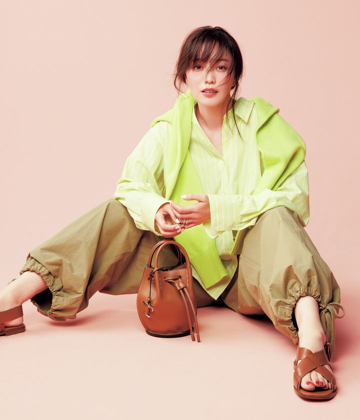 シャツ¥8,910※ 6月上旬入荷予定 肩に巻いたニット¥9,460(ともにミラ オーウェン/ミラ オーウェン ルミネ新宿 2 店)パンツ¥46,200(レスギアトリエ/サードマガジン)バッグ¥223,300サンダル¥135,500(ともにトッズ/トッズ・ジャパン)右手リング¥59,400左手リング〈付け根側〉¥110.000〈指先側〉¥110,000(すべてノアーク/ノウン)