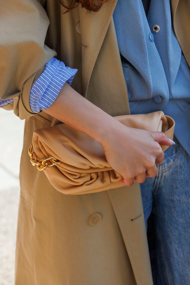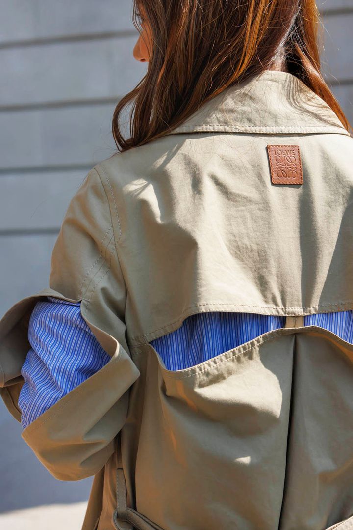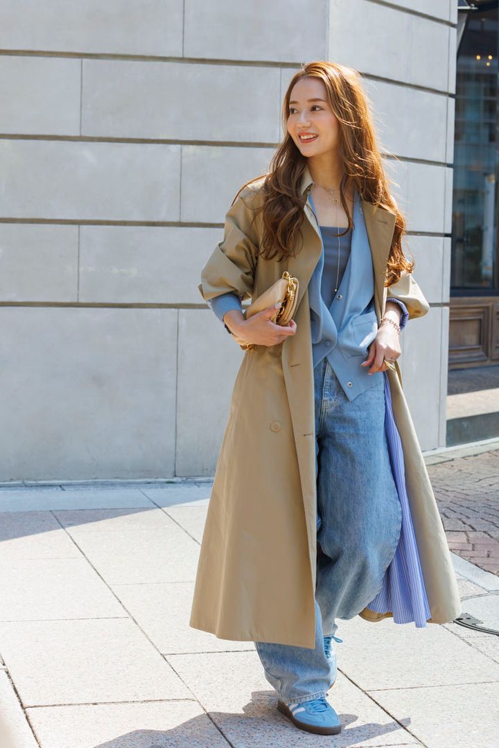 色味、デザイン、細かいところのパーツ使い、とにかくいちいち可愛い(笑)! 特に何も考えずに着るだけで、他と違いがつくデザインがロエベの魅力。シャツとレイヤードされているかのようなデザイントレンチコートはチラ見えするストライプシャツのブルーを際立たせたくて、統一感のあるブルーでまとめました。