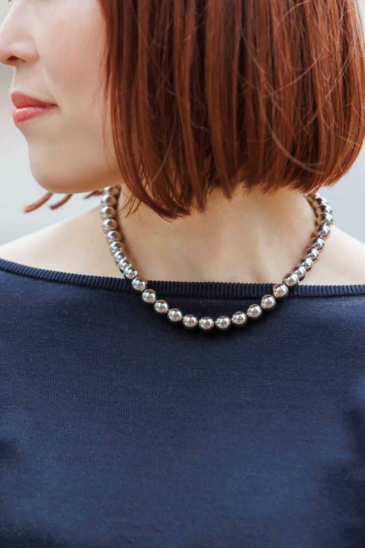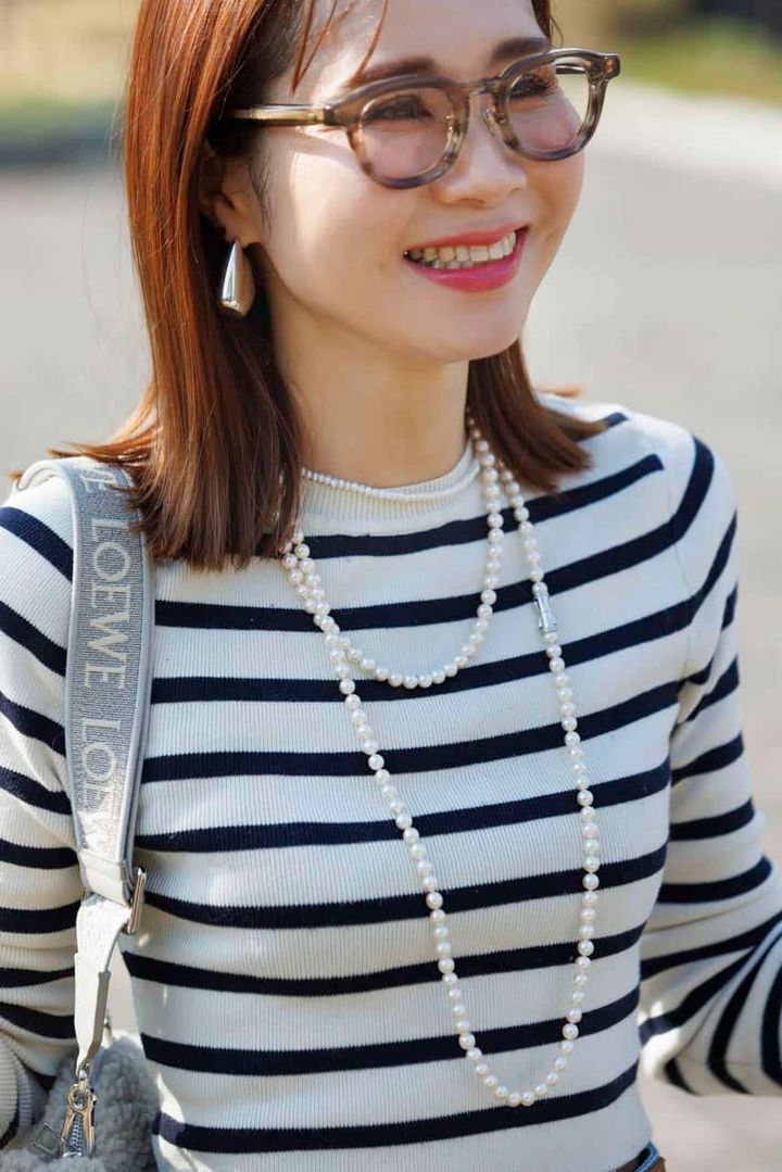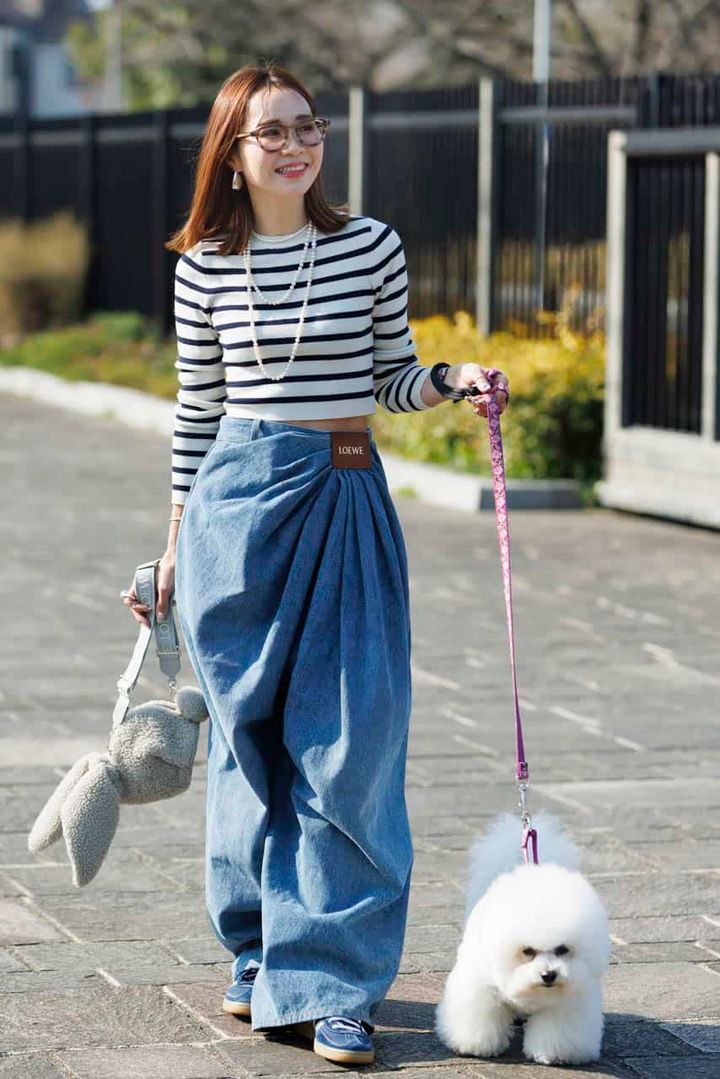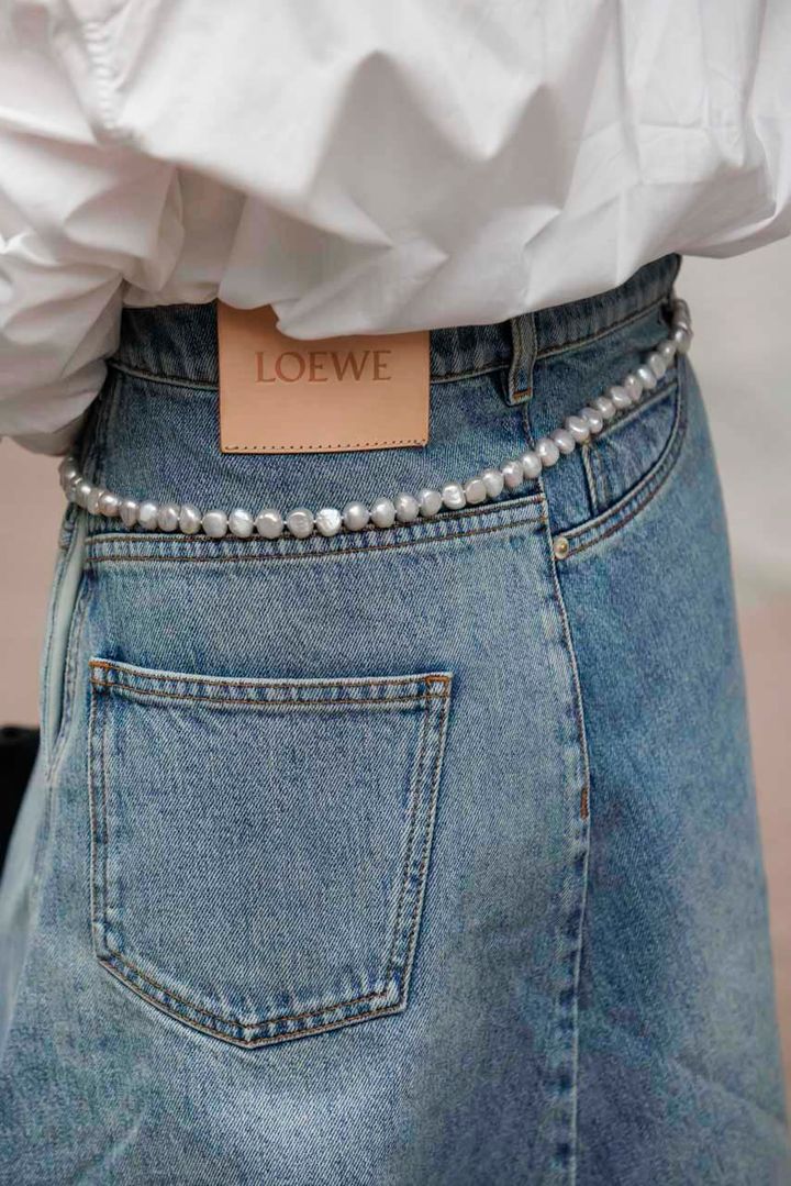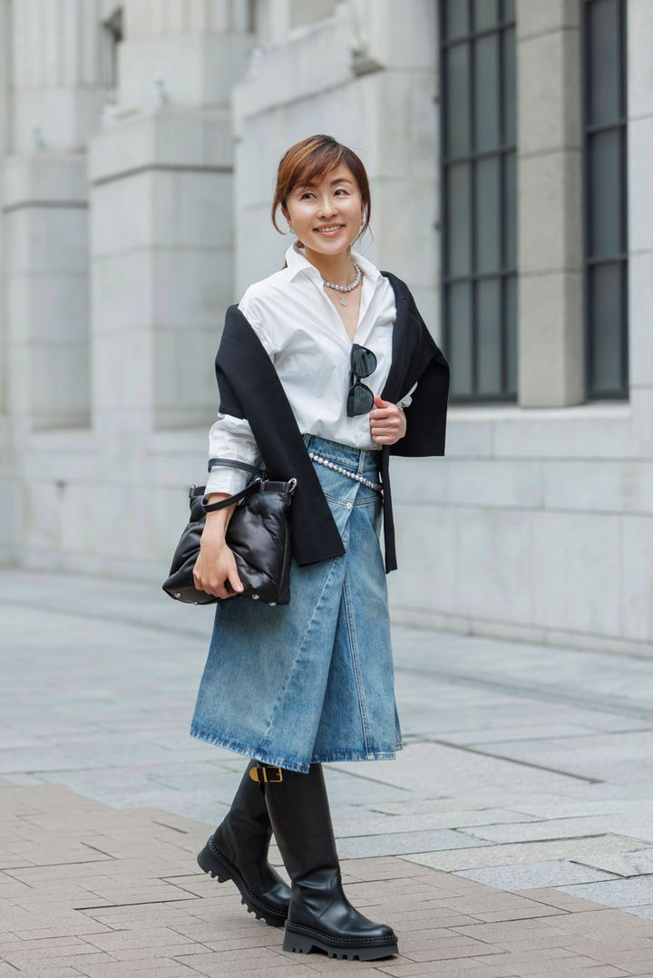 新調したばかりのロエベのスカートはデニムなのにカジュアルすぎないところがお気に入り。カジャビジューのパールネックレスをベルトにしてアレンジを楽しみます。ロエベの洋服は大人カジュアルを楽しめるから格段とオシャレの幅が広がりました。