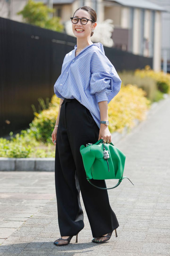 去年、キャメルのゾウさんをお迎えして以来、見た目のインパクトとは裏腹にどんなファッションにも合う汎用性の高さの虜に。あまりの使いやすさに、今年グリーンが発売しているのを知って1月に購入しました。鮮やかなグリーンで、差し色として使えるところがお気に入り。オーバーシャツとパンツでマニッシュにして、バッグで抜け感を出しました。