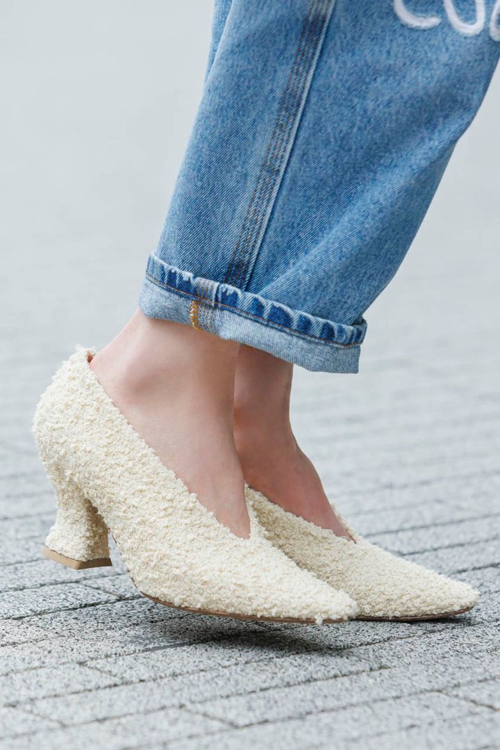周りの友達やインスタでよく見かけ、憧れていたトイヒールのパンプス。店頭で試着したところ、これだけでモード感を出せることに気づき即決。春らしいイエローがかわいく、デニムとも好相性なので買って以来大活躍。カゴバッグは大きめのアナグラムがポイントです。