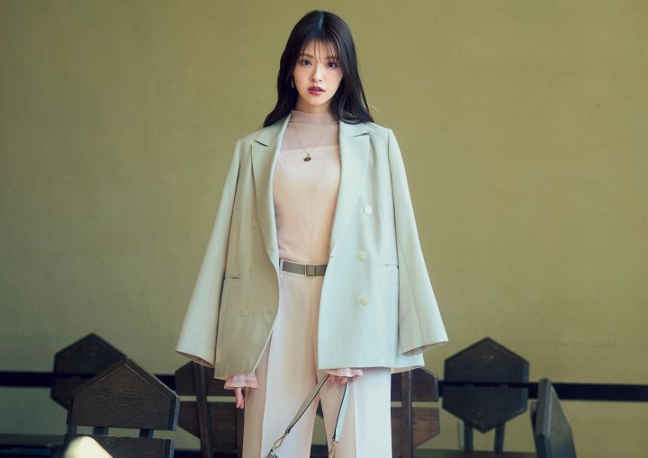 ライトピンクのシアーニットにパンツ、ベージュ色のジャケットを合わせて。全体を淡い色で仕上げることで、端正なルックをギャップのある小粋なスタイルに。