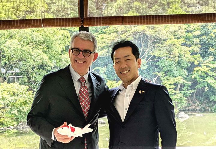 (左から)ジャンルイジ・ベネデッティ駐日イタリア大使と宮崎悦男小千谷市長(駐日イタリア大使館への錦鯉放流式にて、令和6年7月撮影)Harumari Inc.