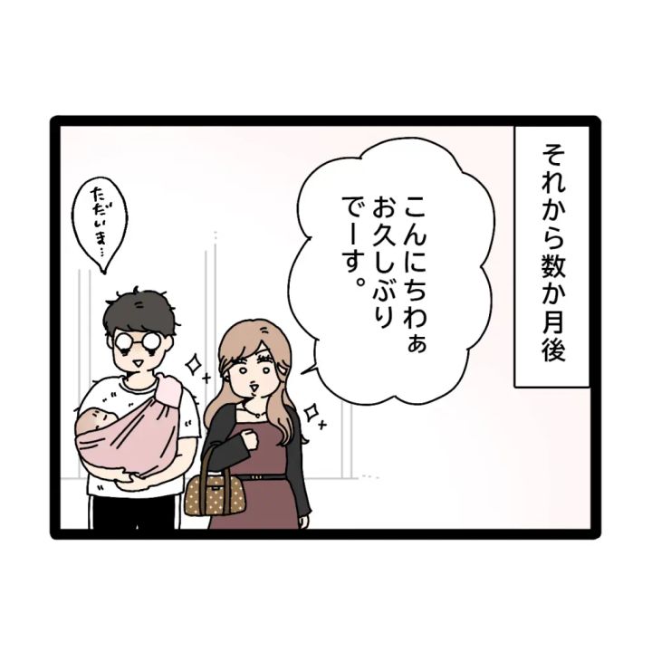 とうとうきみこさんとタカシさんの赤ちゃんが産まれました!「きみこ産まれたって」そう言ってスズさんがお母さんにスマホを差し出すと、お父さんもやって来て覗き込みます。そう、出産のお知らせも、きみこさんのSNSで知ったのでした。「更新疲れないんかな・・」と心配するスズさん。それから数か月が経った頃、「こんにちわぁ。お久しぶりでーす」「ただいま・・」とやって来た2人。キメキメのきみこさんとは対照的に、一段とボロボロのタカシさんがそこにいました。