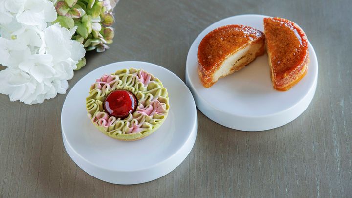 左:ルバーブとラズベリー、ピスタチオのタルト 右:ガトー・ベシャメルby 後藤裕一氏