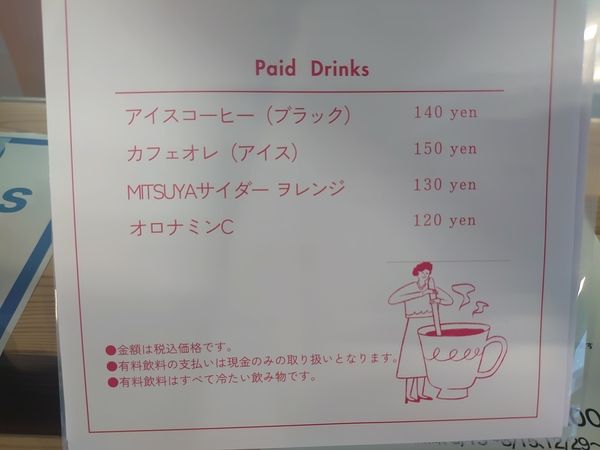 受付が済んだら、フリードリンク(ホットコーヒーor水、お替りOK!)をもらって、空いているお席からご自由に選んでください。アイス系のドリンクは別途有料です。