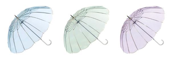 貝殻のようなフォルムときらきらした質感のパイピングが特徴の長傘。風に強い16本骨を採用。価格は3,080円。
