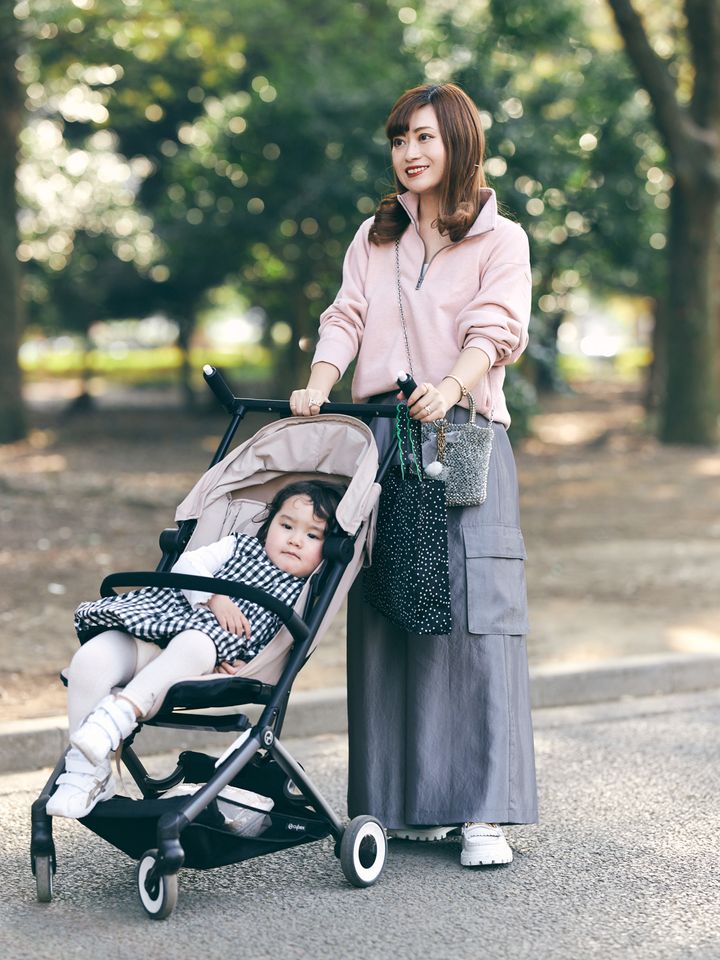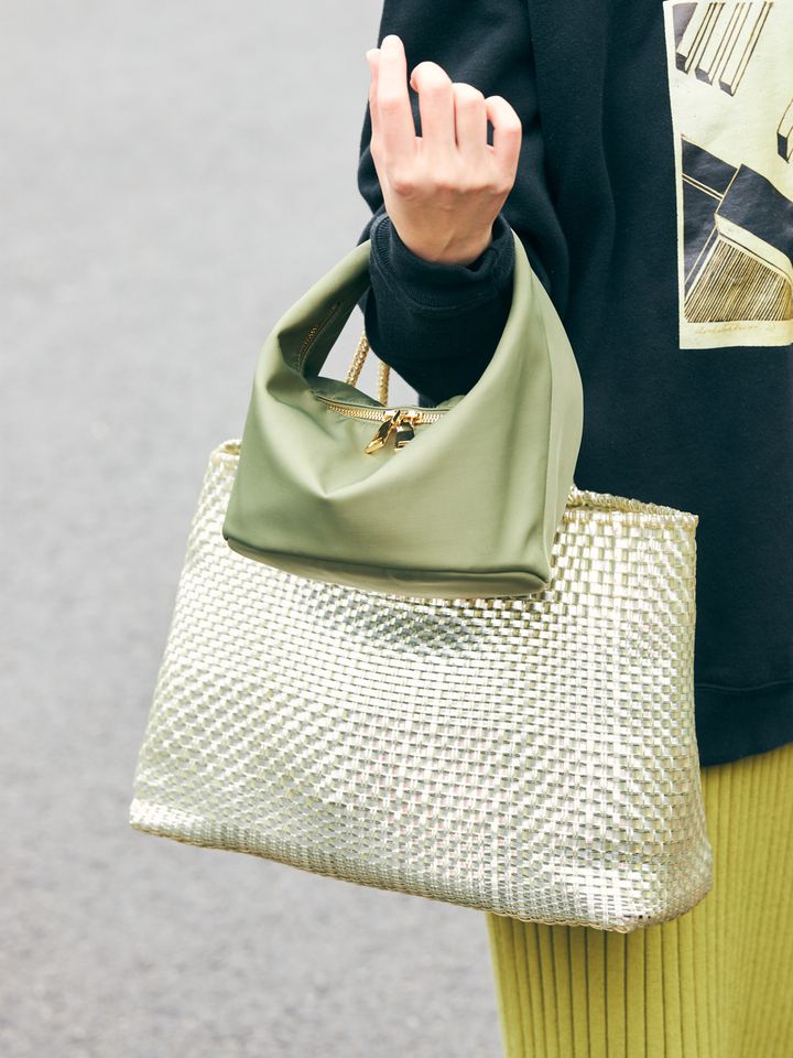「周りとかぶらない大きめのイントレッチオは、マザーズバッグとして数年前に購入。すっきりとした形なのでコンパクトに見えますが、たっぷり荷物が入るんです。物を探さなくていいように、貴重品を入れるミニバッグとの2個持ちが定番。カジュアルな日に持つと華やかさがプラスされ、コーデを格上げしてくれます」川下みどりさん/官公庁勤務・165㎝(10カ月の男の子ママ)