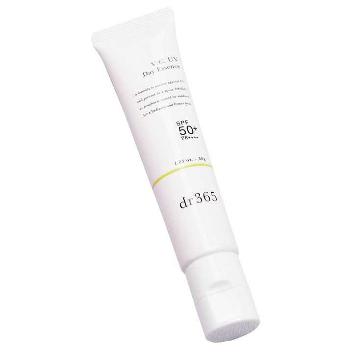 ほぼ美容成分で肌に負担にならない日焼け止めはメイクさんに教えてもらった、dr365 V.C. UVデイエッセンス。つけ心地もべたべたせず、どんなアイテムを上に重ねてもヨレないところが最高!