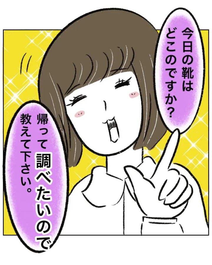 予想外の行動に驚いて言葉の出ないまるさんに、ゆかちゃんママは悪びれることなく「今日の靴はどこのですか?帰って調べたいので教えてください」と笑顔で言いました。