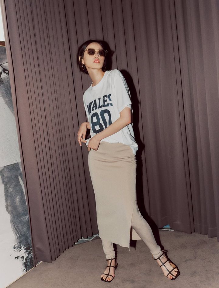Tシャツ¥10,450、レギンス付きスカート¥29,700(共にウィム ガゼット)、サンダル¥26,400(ザ ポーズ/全てウィム ガゼット ルミネ新宿店)、サングラス¥47,300(アイヴァン/アイヴァン 東京ギャラリー)、ピアス¥55,000(ピモンテ)
