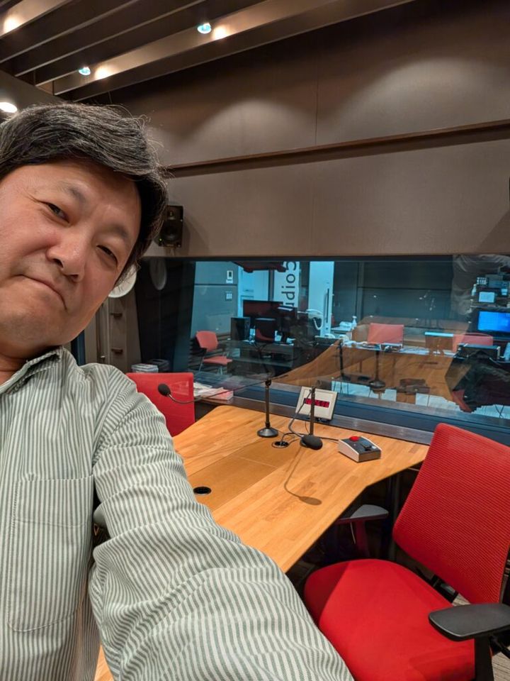写真のラジオスタジオの椅子に二人、座ることになります。