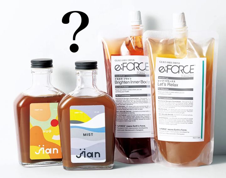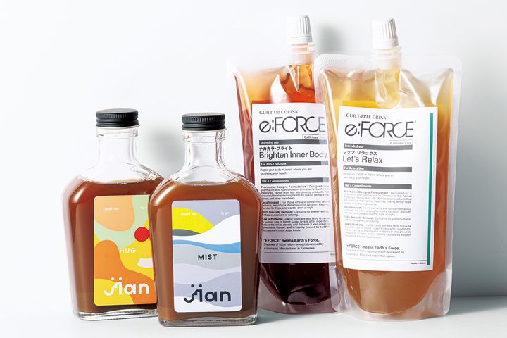 左から・五行診断の結果で状態に適した5フレーバーからチョイス。 ティーシロップMIST、HUG ともに200cc 各¥1,987(jian)健康負債のリセットに着目し薬剤師が開発。Let’s Relax、Brighten Inner Body ともに350g 各¥850(TRADARROWS)