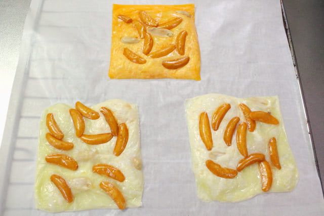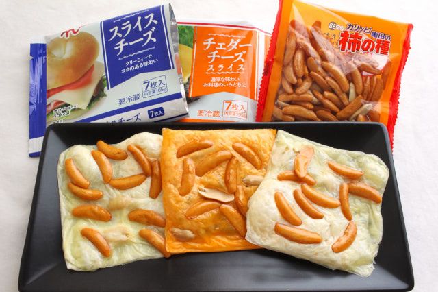 今回は、一般的な白っぽいスライスチーズと、オレンジ色のチェダーチーズの2種類で作ってみます。スライスチーズ3枚に約1/2袋の柿の種を、まんべんなく乗せました。