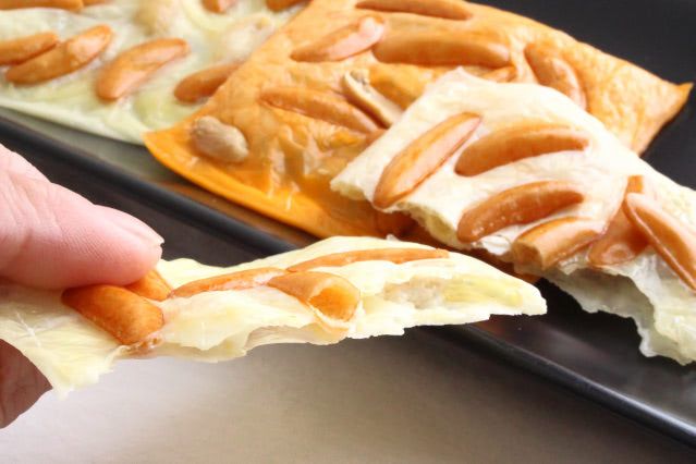 食べてみると、チーズがパリパリで、柿の種がサクサク。とにかく軽~い食感で、チーズの旨味が濃厚!おやつにもおつまみにも、ぴったりなおいしさです♪柿の種は、そのまま食べると少し唐辛子の辛味を感じますよね、けれど、チーズに乗せると、辛味を感じずにいただけます。