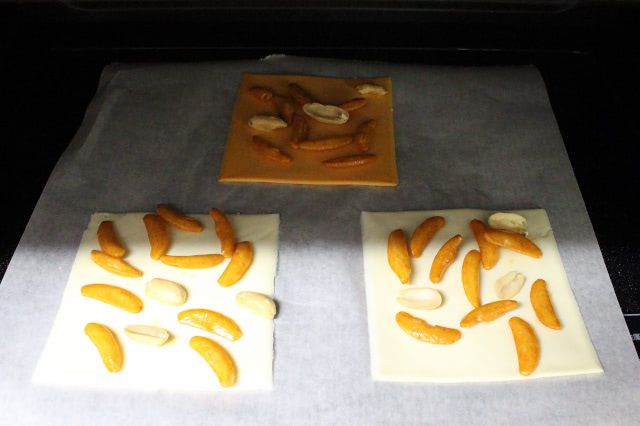 1. クッキングシートの上にスライスチーズを乗せ、柿の種を好きなだけトッピングします。