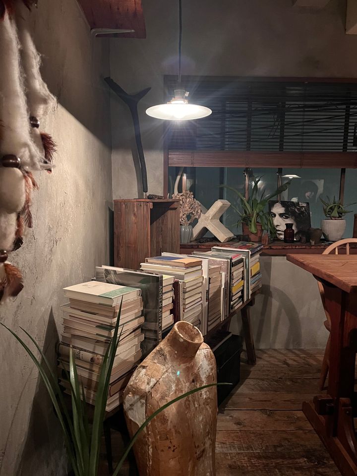 特に店内奥の4人がけのお席の横には気になる題名ばかりの本が詰まれています。