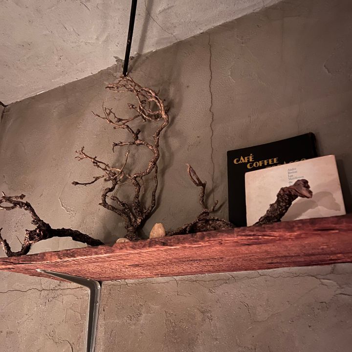 コンクリートベースの店内には本やアート作品などたくさんの個性豊かなアイテムが飾られていました。