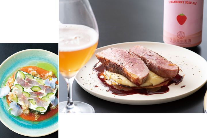 〈右〉皮目は香ばしく、中はジューシーなロゼ色に焼き上げた鴨胸肉に、パースニップのピュレとマデラソース。苺の風味があふれるビールとのペアリングも楽しい。鴨のロースト¥3,200、クラフトビール¥950〈左〉素材が織りなす味わいと断面の美しさを堪能したい。真アジときゅうり、フロマージュブランのテリーヌ みょうがとトマトのソース¥1,200