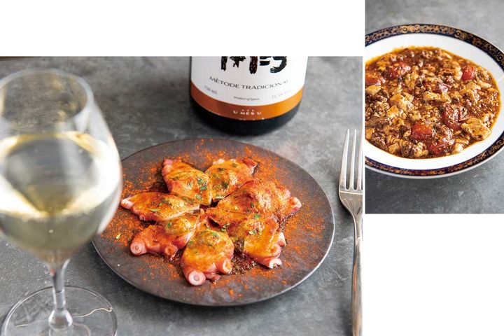 〈左〉柔らかなタコに色鮮やかなパプリカのソースをあしらい、セロリのドレッシングで爽やかな味わいを添えて。タコの冷製 スペインガリシア風¥880、グラスワイン¥850~〈右〉ラム肉&トマトという相性抜群の組合せに、自家製のラー油とデュカをプラスして香り豊かに仕上げた一皿。ラムとトマトの麻婆豆腐¥1,650