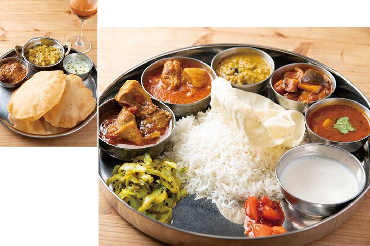〈右〉カレー2種、ラッサム、サンバル、クートゥにライタ、ポリヤル…それぞれを食べ進めるほどに味わいの豊かさに引き込まれる。ミールス¥1,900〈左〉全粒粉を使った揚げパンのプーリーは、ココナッツチャトニとじゃがいもカレー、おすすめのビーフカレーとともに。プーリーセット¥1,600、グラスワイン¥600