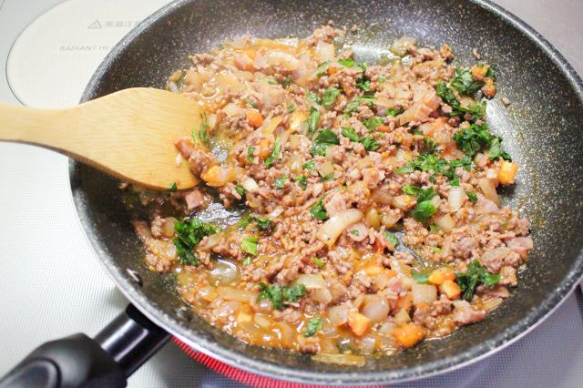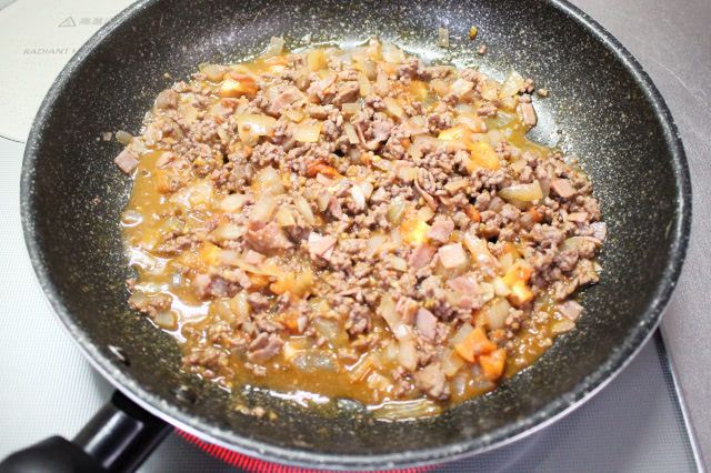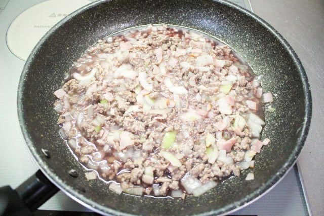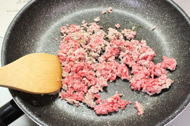 今回は中玉トマトのサイズに合わせて合いびき肉を200gに減らしたので、その半量の100gを炒めました。2分ほど炒めると半分くらいの色が変わりました。