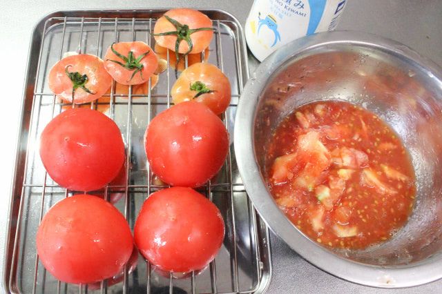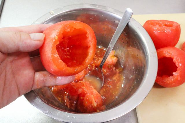 くり抜いたトマトを器として使うので、破れないように果肉を取り出してくださいね。