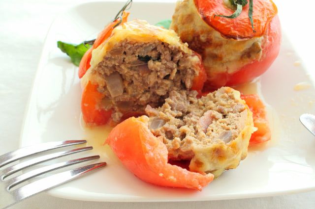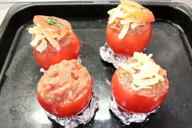 8. 1のトマトに肉だねをすき間なくたっぷりと詰めます。ピザ用チーズと1のトマトの上部を乗せ、180℃に予熱したオーブンで15~20分焼きます。