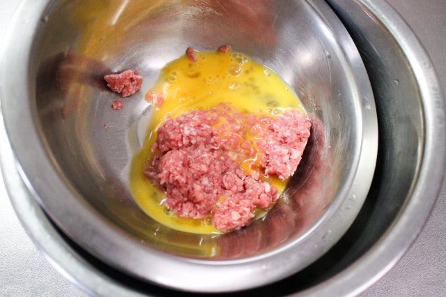 味付けひき肉を半量だけ使うことにしたので、合いびき肉100gと卵1個もそれぞれ半量を混ぜました。氷水に当てながら混ぜると、手の熱で合いびき肉の脂がとけ出すことなく、練れますよ。