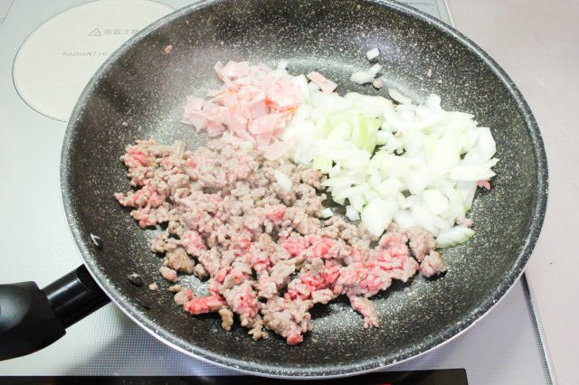 ベーコン、玉ねぎ、にんにくを同時に加え、3分ほど炒めると、玉ねぎが透き通りました。