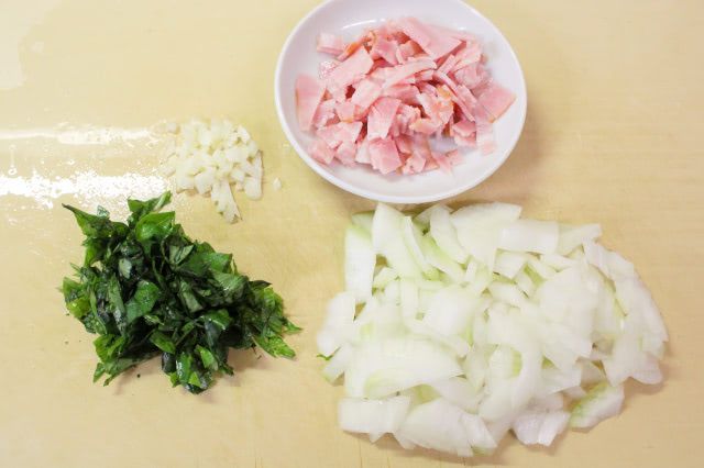 2. 玉ねぎ、にんにく、バジル、ベーコンをみじん切りにします。