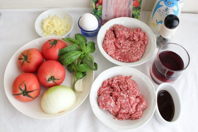 今回は中玉トマトを用意したので、動画で紹介されていた合いびき肉、赤ワイン、ウスターソースの分量を6割に減らして作ってみます。