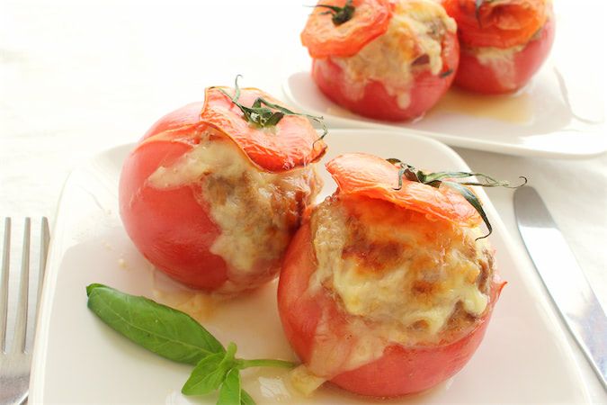 生のひき肉+調理済みのひき肉コンビで南仏風の「トマトファルシ」に♪