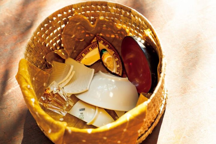 “金継ぎ待ち”の器はバスケットにまとめて。