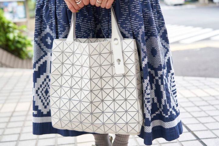 バッグはスカートの幾何学とあえてリンクさせて、モダンなバオバオバッグ。「おしゃれなうえに、A4サイズの書類が入るので、展示会場で配布される資料を入れるのに便利なんです」(金さん)