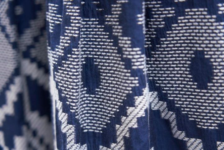 オリエンタルな雰囲気の幾何学柄のジャカードスカート。「ブルーのトップスに合わせて今回はネイビーを選びました。色違いでグレー×ライトブルーもあり、そちらも人気です」(金さん)